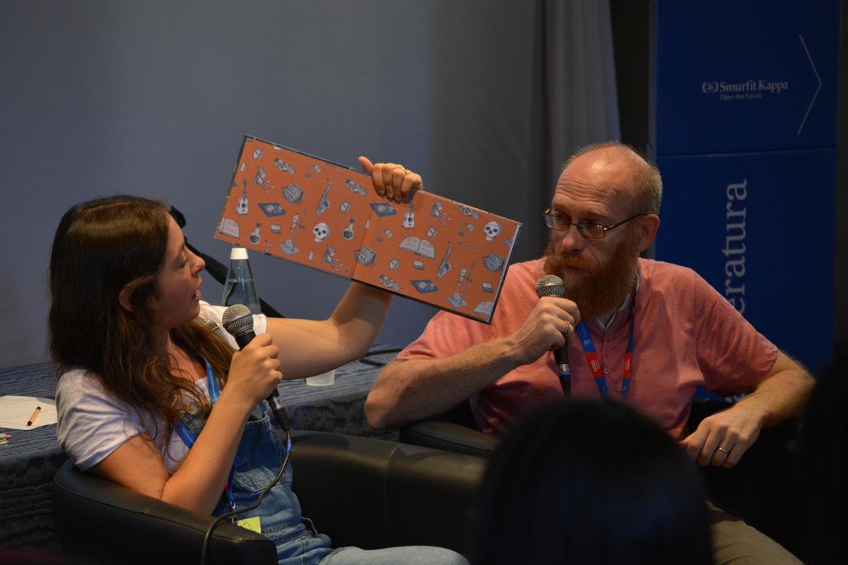 La poetessa Silvia Vecchini e l'illustratore Sualzo hanno raccontato al pubblico quasi interamente composto da ragazze con immagini e parole il loro nuovo fumetto chiamato "forse l'amore".