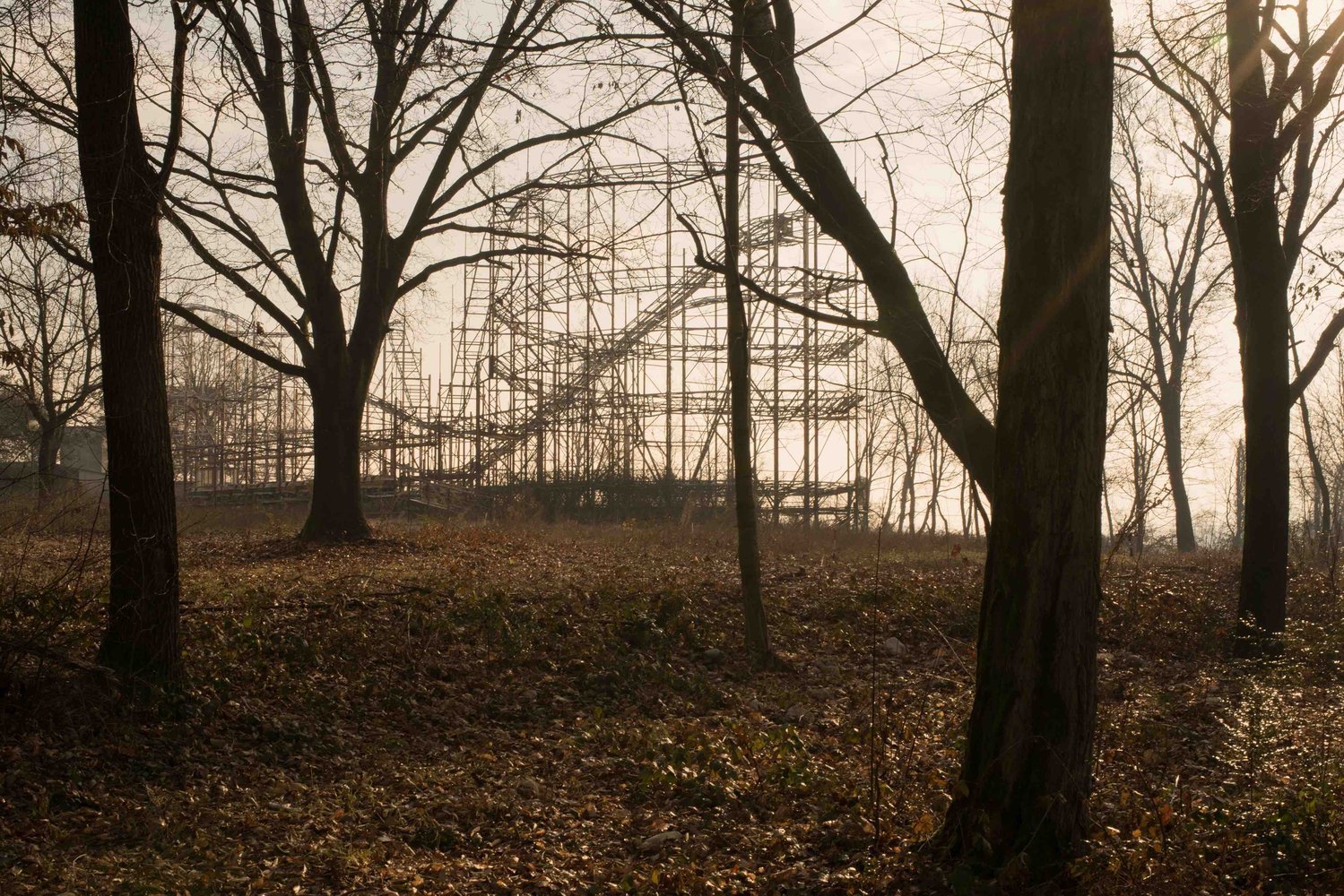 , di un luogo ormai sprofondato in un balbettio afasico. Percorrendo via del Laghetto, la strada che dal paese di Limbiate conduce al vecchio parco divertimenti, non s'incontrano che ruderi in mattoni scoloriti, ossature in cemento, cavi gommosi appesi agli alberi, infissi per finestre gettati fra le chiazze di erba alta e robusta – dettagli di un paesaggio frantumato, illeggibile come la pagina di un libro in cui qualcuno si sia divertito a scombinare tutte le lettere. Ma è