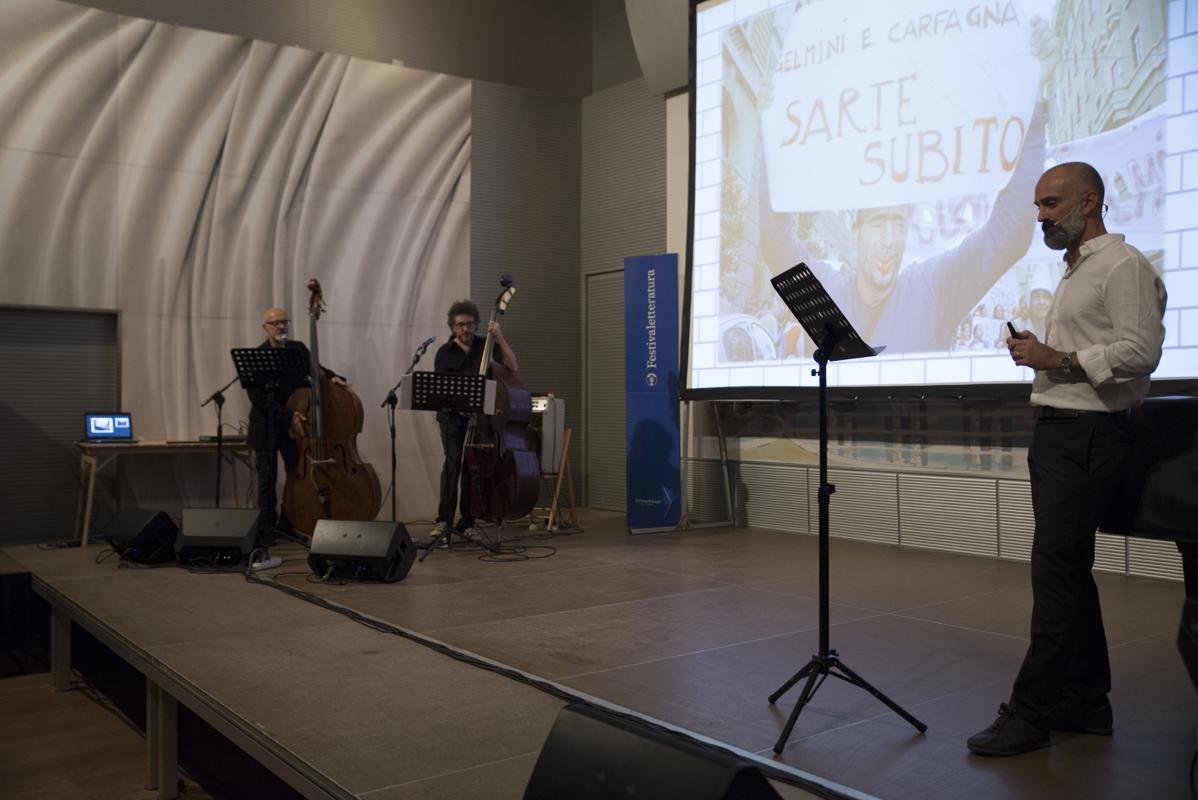 Le corde dei contrabbassi di Raffaello Pareti e Ferruccio Spinetti vengono pian piano pizzicate, e ci regalano un sottofondo sonoro unico e leggero che ci fa sorridere ancora di più mentre ci rendiamo conto dei paradossi di certi slogan del passato raccontati da Giuseppe Antonelli . Si passa poi al voto elettorale degli anni ’60 e 70’, ai movimenti femministi che citano “tremate, tremate le streghe son tornate” e poi, tutt’a un tratto, ci si rende conto che nessuno usa più la parola “abbasso” . E’ scomparsa, passata di moda. Man mano che ci avviciniamo al Duemila, il definitivo NO invade la pubblicità e, per farla semplice, è accompagnato solo da sostantivo: “No martini, no party” che «suona melodico come “Io Tarzan,tu Jane”», commenta Antonelli. Combinare parole e musica è sempre un’ottima trovata, le emozioni che si provano in quei momenti sono sempre le migliori.