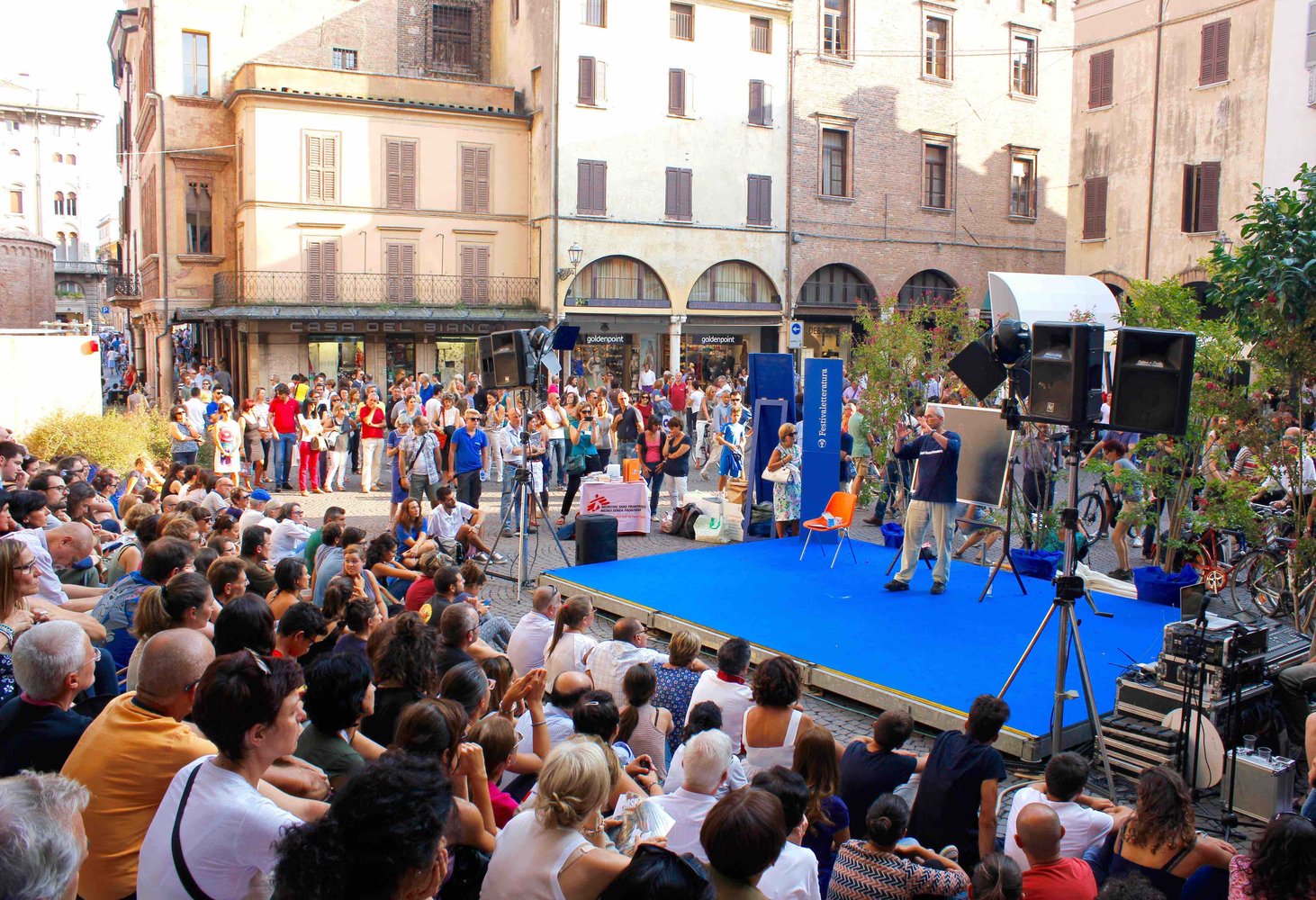 In Piazza Leon Battista Alberti si terranno come di consueto le rassegne stampa delle Pagine della cultura con i giornalisti di Internazionale e diversi ospiti stranieri, gli appuntamenti di Scritture Giovani , le sessioni di pitching in piazza di Meglio di un romanzo , le ormai classiche interviste dei volontari di Blurandevù . Al Palazzo dell'Inps , da mercoledì a domenica potrete vedere all'opera l' officina di Prototipi , mentre all' Ex Cinema Bios vi attende a tutte le ore del giorno una sontuosa Biblioteca Elegante dedicata alla moda nella letteratura italiana, che prevede tra l'altro quattro appuntamenti extra con Stefania Ricci, Francesca Piani, Elvira Seminara e Hans Tuzzi. La Tenda dei libri , oltre a ospitare la libreria del festival, sarà sede delle Parole del cibo e della Biblioteca di Alessandria . Nell'adiacente Tenda Sordello potrete godervi il programma degli accenti , trasmessi anche quest'anno in diretta streaming. Da non perdere anche la ricchissima rassegna di Letture in piazza a opera della Compagnia della Lettura, che si svolgerà nella suggestiva cornice di Piazza Concordia . E se avete un debole per la fisica, la musica e i classici, dopo un salto al Punto informativo sulle migrazioni in Piazza Erbe , nella vicinissima Piazza Mantegna potrete ascoltare le lezioni di scienza all'aria aperta della rassegna lavagne .