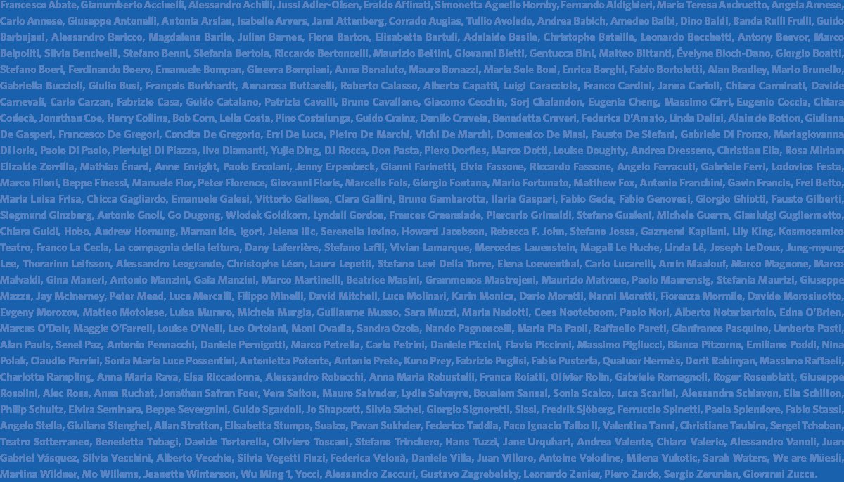 Andrea V alente; Chiara Valerio; Alessandro Vanoli; Juan Gabriel Vásquez; Silvia Vecchini; Alberto Vecchio; Silvia Vegetti Finzi; Federica Velonà; Daniele Villa; Juan Villoro; Juan Villoro; Antoine Volodine; Milena Vukotić;