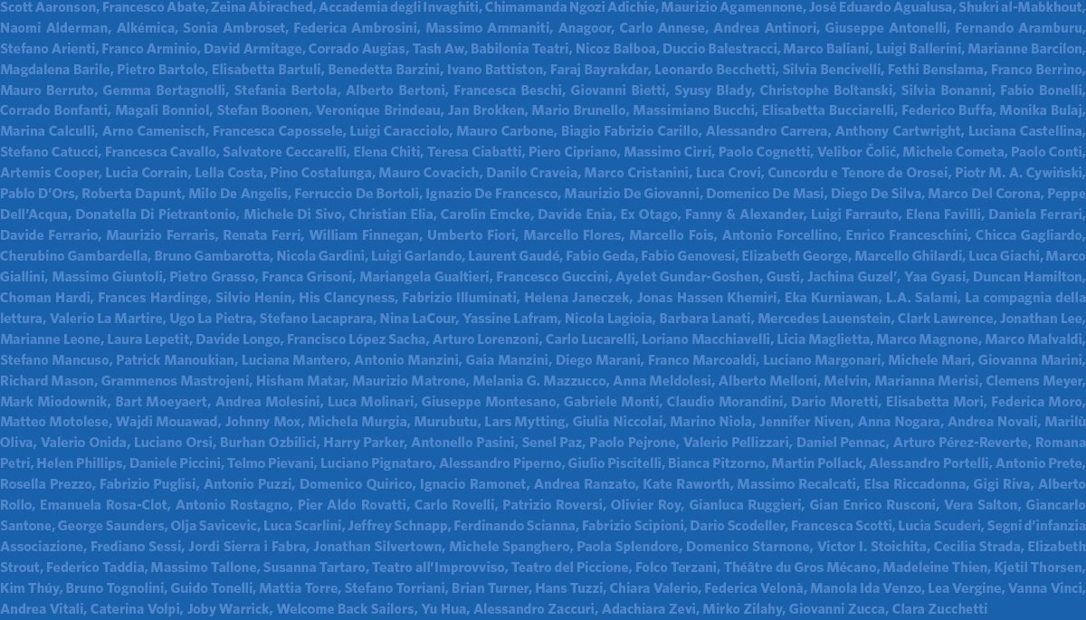 Arno C amenisch; Francesca Capossele; Luigi Caracciolo; Mauro Carbone; Raffaele Cardone; Biagio Fabrizio Carillo; Alessandro Carrera; Anthony Cartwright; Luciana Castellina; Elena Catozzi; Stefano Catucci; Francesca Cavallo; Salvatore Ceccarelli; Mara Cerri; Elena Chiti; Teresa Ciabatti; Piero Cipriano; Massimo Cirri; Paolo Cognetti; Velibor Čolić; Michele Cometa; Paolo Conti; Artemis Cooper; Lucia Corrain; Lella Costa; Pino Costalunga; Mauro Covacich; Danilo Craveia; Marco Cristanini; Luca Crovi; Cuncordu e Tenore de Orosei; Piotr M. A. Cywiński;