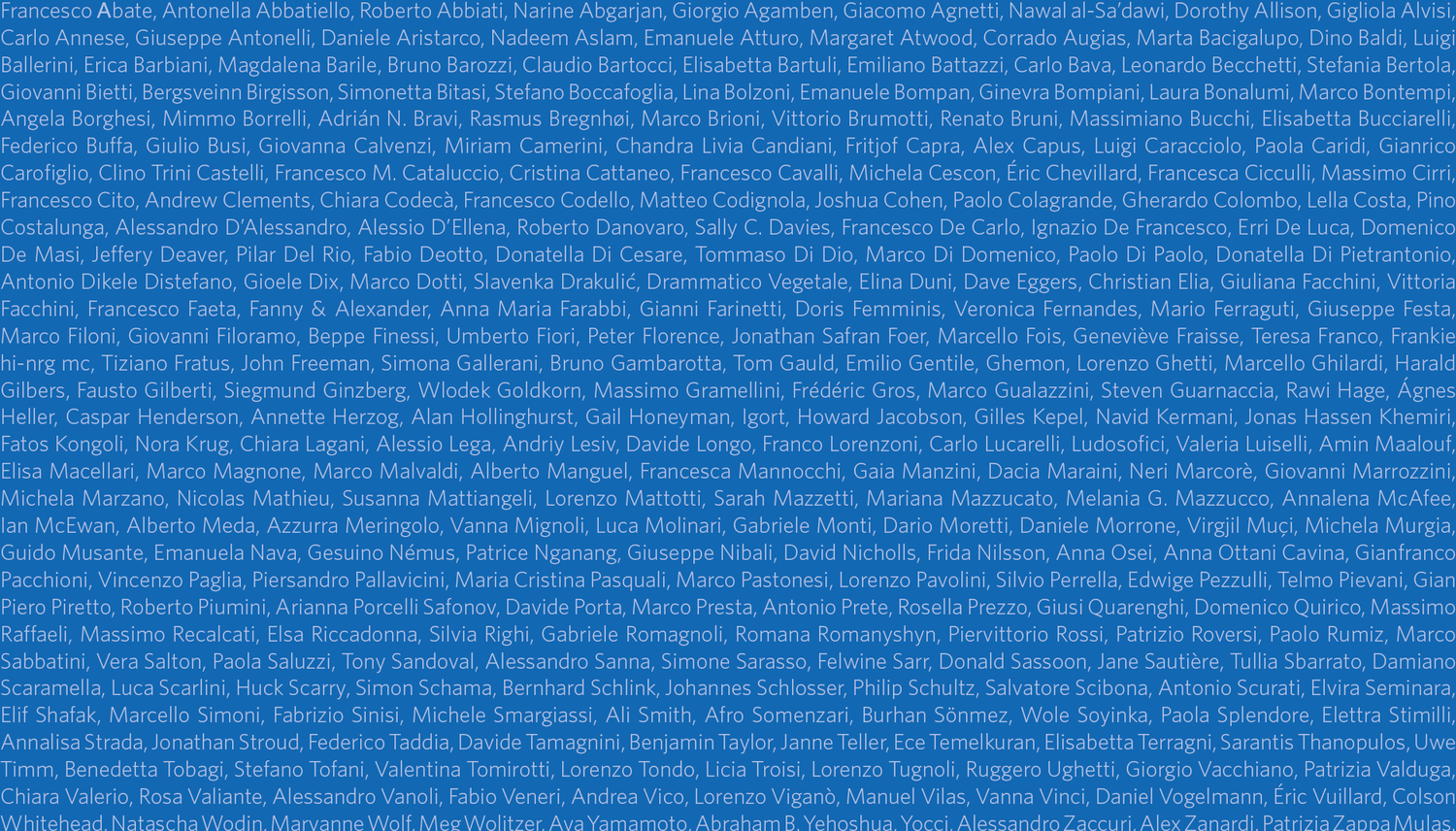 Amin M aalouf, Elisa Macellari, Marco Magnone, Elia Malagò, Marco Malvaldi, Alberto Manguel, Cinzia Manicardi, Francesca Mannocchi, Gaia Manzini, Barbara Mapelli, Dacia Maraini, Neri Marcorè, Giovanni Marrozzini, Michela Marzano, Nicolas Mathieu, Maurizio Matrone, Susanna Mattiangeli, Lorenzo Mattotti, Sarah Mazzetti, Mariana Mazzucato, Melania G. Mazzucco, Annalena McAfee, Ian McEwan, Alberto Meda, Azzurra Meringolo, Paola Minaccioni, Vanna Mignoli, Luca Molinari, Gabriele Monti, Dario Moretti, Daniele V. Morrone, Virgjil Muçi, Elvira Mujčić, Michela Murgia, Guido Musante, Andrea Musso,
