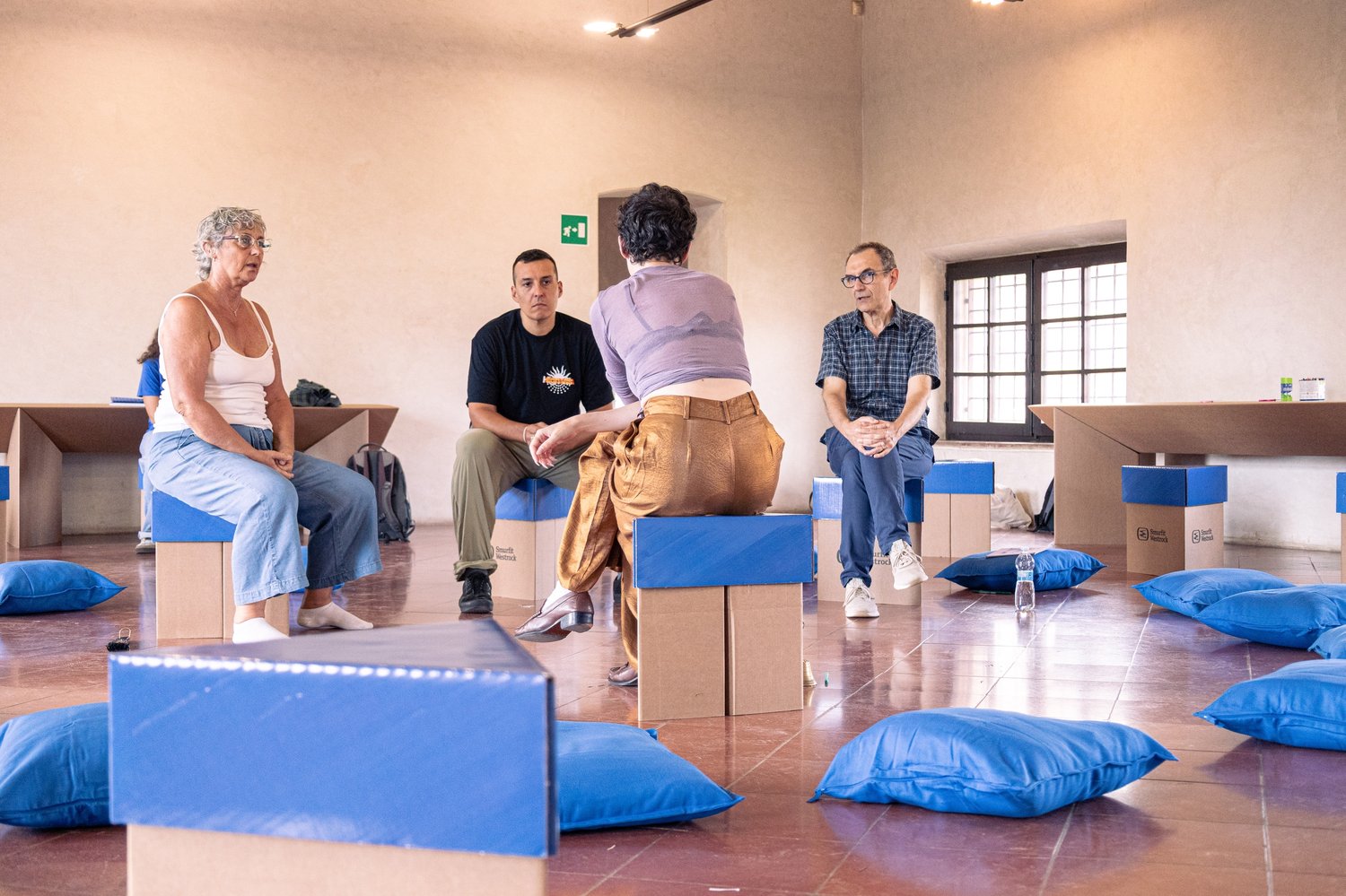 Al secondo piano di Palazzo Te, dove la luce filtra obliqua dalle grandi finestre quadrate e i soffitti sembrano custodire ancora il respiro dei secoli passati, un gruppo di persone si siede in cerchio. Non ci sono sedute monumentali, soltanto sgabelli di cartone e cuscini blu, un arredo che spoglia il palazzo della sua aura e lo rende ambiente intimo, quasi domestico. È in questo spazio, sospeso fra l’imponenza della storia e la leggerezza di un esperimento collettivo, che prende forma il primo appuntamento del laboratorio di Deep Listening per Festivaletteratura guidato da Diana Lola Posani, sound artist, performer vocale e prima facilitatrice italiana di una pratica che è al tempo stesso musicale, politica e terapeutica.