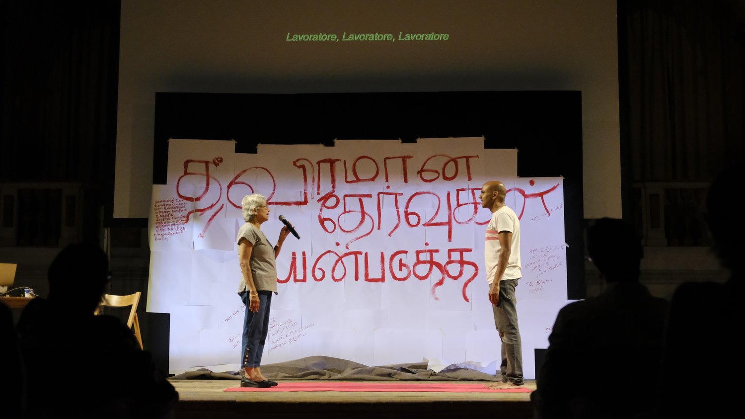 Per entrare nel teatro Bibiena di Mantova occorre scivolare attraverso un porticciolo di legno. Lo spazio è raccolto, intimo; ogni passo riverbera sulla scena. Una melodia lontana si avvicina: proviene da una radiolina sul palco, le note di Urvasi Urvasi che fluiscono leggere. Di fronte al pubblico, già sistemato, una donna – Mala Ratnamohan – traccia con la tinta rossa dei caratteri in alfabeto tamil su fogli improvvisati.