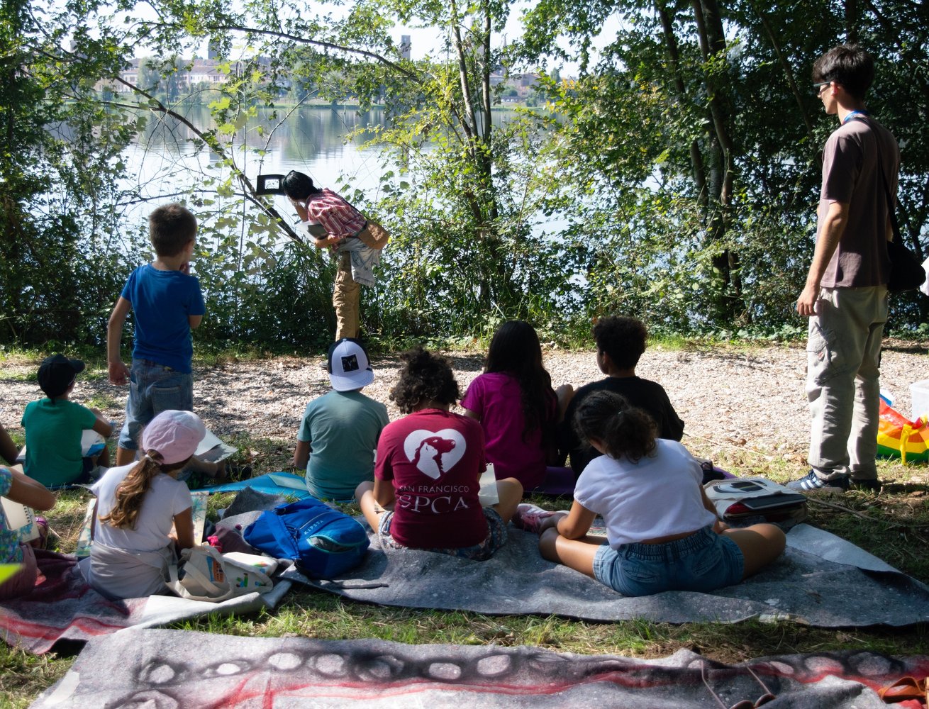 Spesso il punto di partenza delle domande che l’artista rivolge ai suoi uditori sono albi illustrati, da contemplare, interrogare e rappresentare insieme servendosi degli strumenti del mestiere: matite, acquerelli, tempere e pastelli. Questa volta, invece, a stimolare i più piccoli sono l’erba ancora umida di rugiada e i suoi abitanti, un rametto spezzato, una foglia mangiucchiata o la vista spettacolare su Mantova di cui si gode dalla riva opposta del Mincio. Non è una lezione di disegno, ma un’esperienza diretta della natura quella che l’artista intende regalare. Un’esperienza lontana dal caos e dall’inquinamento della città, ma anche dalle sue comodità. Eppure, i bambini non sembrano accorgersi che la terra è irregolare, l’aria umida o il sole già caldo, perché sono troppo presi dalla ricerca del soggetto del loro disegno. «Potete anche alzarvi, muovervi, cercare…», li incoraggia Baboni, offrendo loro uno strumento che tira fuori dal suo zaino come un coniglio da un cilindro: l’inquadratorio. Non si tratta altro, in realtà, di un cartoncino nero con un ritaglio rettangolare al centro, che serve a mettere meglio a fuoco il proprio sguardo, ma nella sua semplicità trasmette ai piccoli artisti l’importanza di scegliere su cosa concentrarsi e, allo stesso tempo, il valore della condivisione. Per il resto, i bambini non hanno a disposizione che un foglio e una matita. «Avete solo delle matite, ma le matite possono fare tantissimo, possono anche colorare, fare delle sfumature dal nero al grigio», spiega l’artista, e per un’ora e mezza questo sembra abbastanza per stare bene.