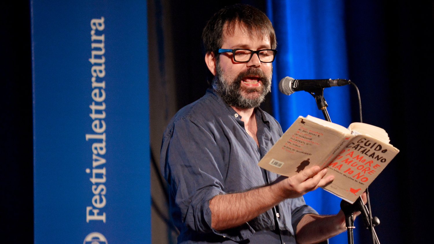 Esordisce confessando le origini mantovane della madre, Guido Catalano . Con l’approccio che lo contraddistingue, a metà via tra tra il timido e l’irriverente, il “poeta semiprofessionista” arriva al suo primo Festivaletteratura con un format insolito, sia per lui stesso che per la kermesse. Riprendendo le gesta ero(t)iche del protagonista (quasi autobiografico) del romanzo D’amore si muore ma io no , infatti, Catalano propone al pubblico del Festival un’edizione speciale della sua “Posta del Colon” , rubrica in cui ogni lettore può chiedere al poeta consigli sulle proprie pene amorose.