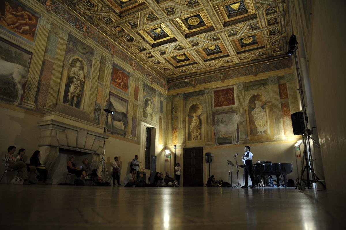 La prima serata, quella di giovedì 7 settembre, ha visto diversi eventi snodarsi tra le sale monumentali e i cortili del palazzo. Diversi per genere e per atmosfere: dal progetto Singing american poetry di Massimo Giuntoli e Clara Zucchett i, che mette in musica le parole dei grandi poeti americani (Emily Dickinson, Gertrude Stein e Jack Kerouac, per dirne alcuni), al reading A due voci del poeta Franco Marcoaldi e il fisarmonicista Ivano Battiston che hanno letto e musicato la raccolta di poesie Tutto qui (Einaudi, 2017). Fino ad arrivare a La camera della musica (da camera) , con il pianista Giovanni Bietti e la soprano Gemma Bertagnolli , che nella sala di Amore e Psiche hanno raccontato ed eseguito brani del tardo romanticismo tedesco.