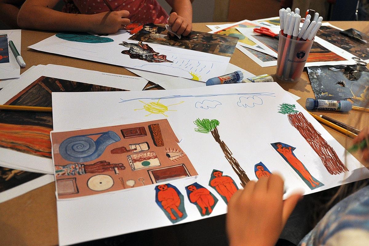 Ecco cosa hanno dovuto fare i piccoli artisti oggi con forbici, matite, carta colorata, pennarelli e soprattutto molta fantasia. Il lavoro consisteva nel ritagliare delle fotocopie di opere famose per poi incollarle in diversi modi e creare una storia. I ragazzi hanno quindi rielaborato quadri di diversi generi ed epoche fino a trarne delle vere e proprie storie, come bande di gatti canterini, ballerine in sale aristocratiche e piccoli amori appena sbocciati.