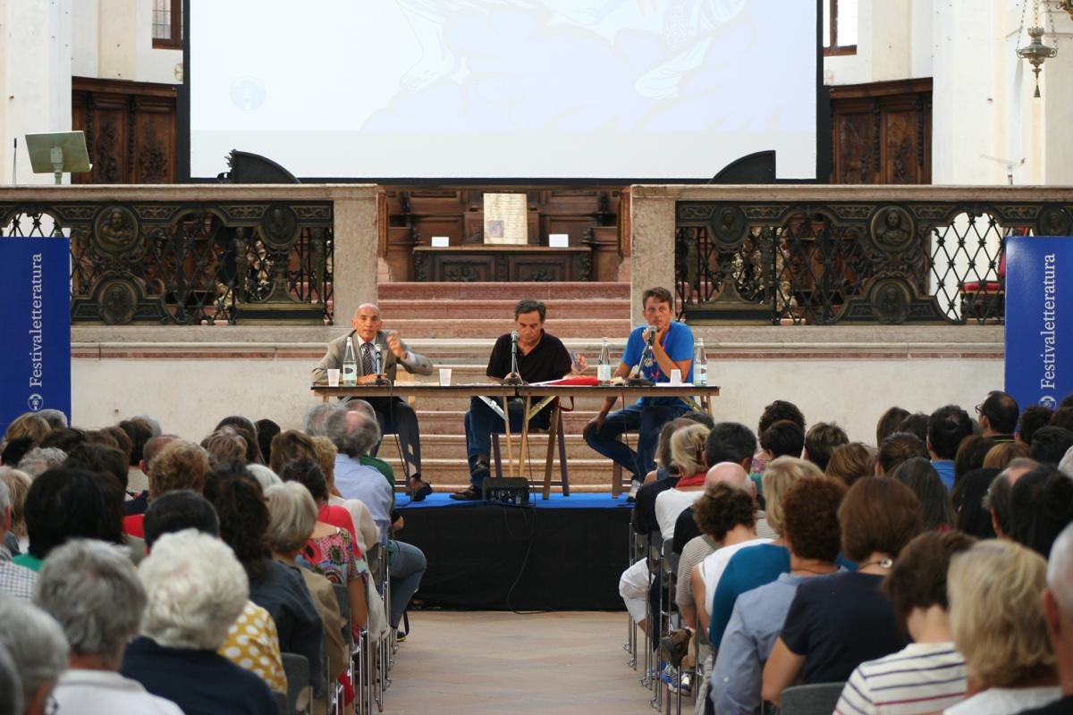Circondati dal bianco marmo della Basilica Palatina di Santa Barbara , Franco Lorenzon e Domenico Quirico , entrambi narratori di esperienze, parlano di guerra e consapevolezza civica. Lo sguardo ravvicinato e affilato di un giornalista inviato sul campo si confronta con lo spirito didattico di un maestro della scuola elementare su un tema tanto attuale quanto poco considerato.
