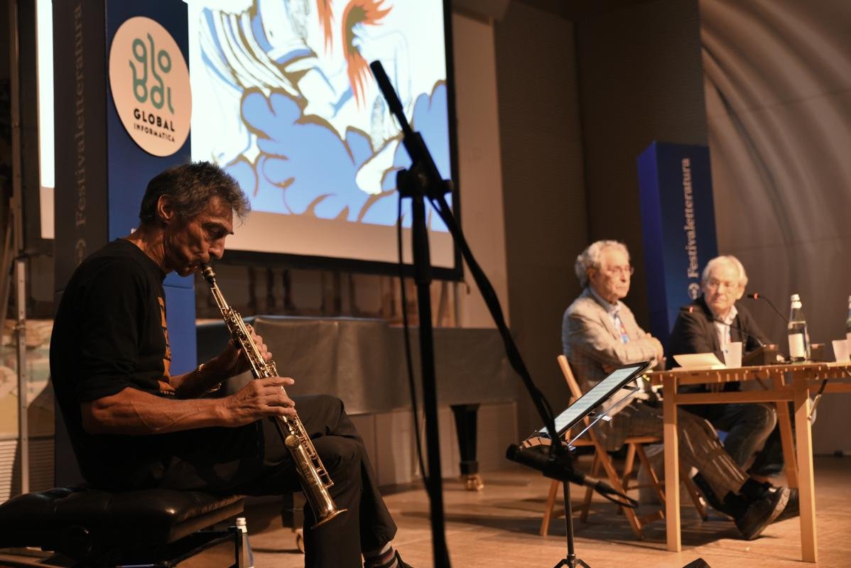 Il traduttore quando si «infila nella ragnatela della lingua», dice Antonio Prete , a forza di scomporre e ricomporre, rischia di diventare ragno e di finire a fare il poeta. Questo è quello che è successo a lui, massimo esperto di Leopardi e traduttore di molti scrittori: la sua ultima raccolta poetica si chiama Tutto è sempre ora , uscita quest’anno per Einaudi. Ne discute col critico Massimo Raffaeli , accompagnati dalle esplorazioni tra violoncello e sax soprano di Marco Remondini . Legge alcuni suoi versi: si sente l’ombra lunga di Leopardi, il pensiero che si fa poesia, interrogativo e percettivo, come nel testo che dà titolo alla raccolta: