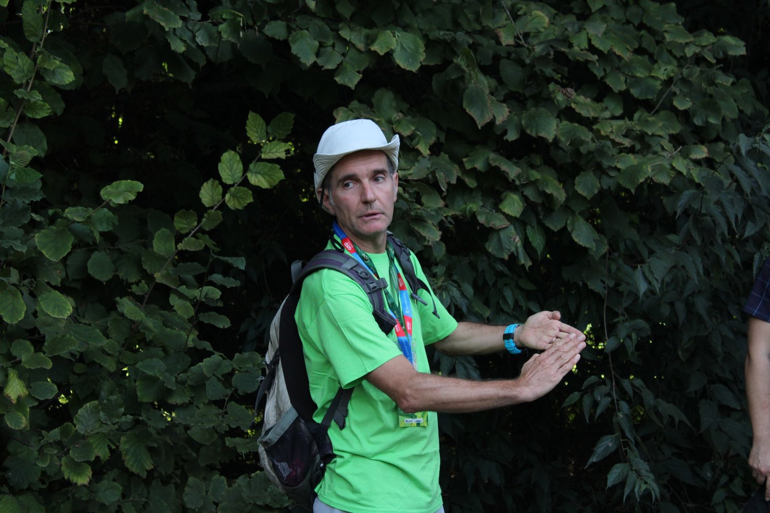Poco oltre, l’acqua comincia a raccontare a modo suo. Nuvolette di fango salgono dal fondo, segno della presenza discreta delle carpe che smuovono i sedimenti. Camminiamo piano, scrutando ogni dettaglio: anche senza vedere direttamente gli abitanti del bosco, ci sono tracce che parlano di loro. Bruchi farfallina si arrampicano sulle superfici vegetali e Corrado Benatti ci mostra come riconoscerli dal lavoro che lasciano dietro di sé: foglie intagliate, rosicchiate, piccoli arabeschi naturali incisi nel verde.