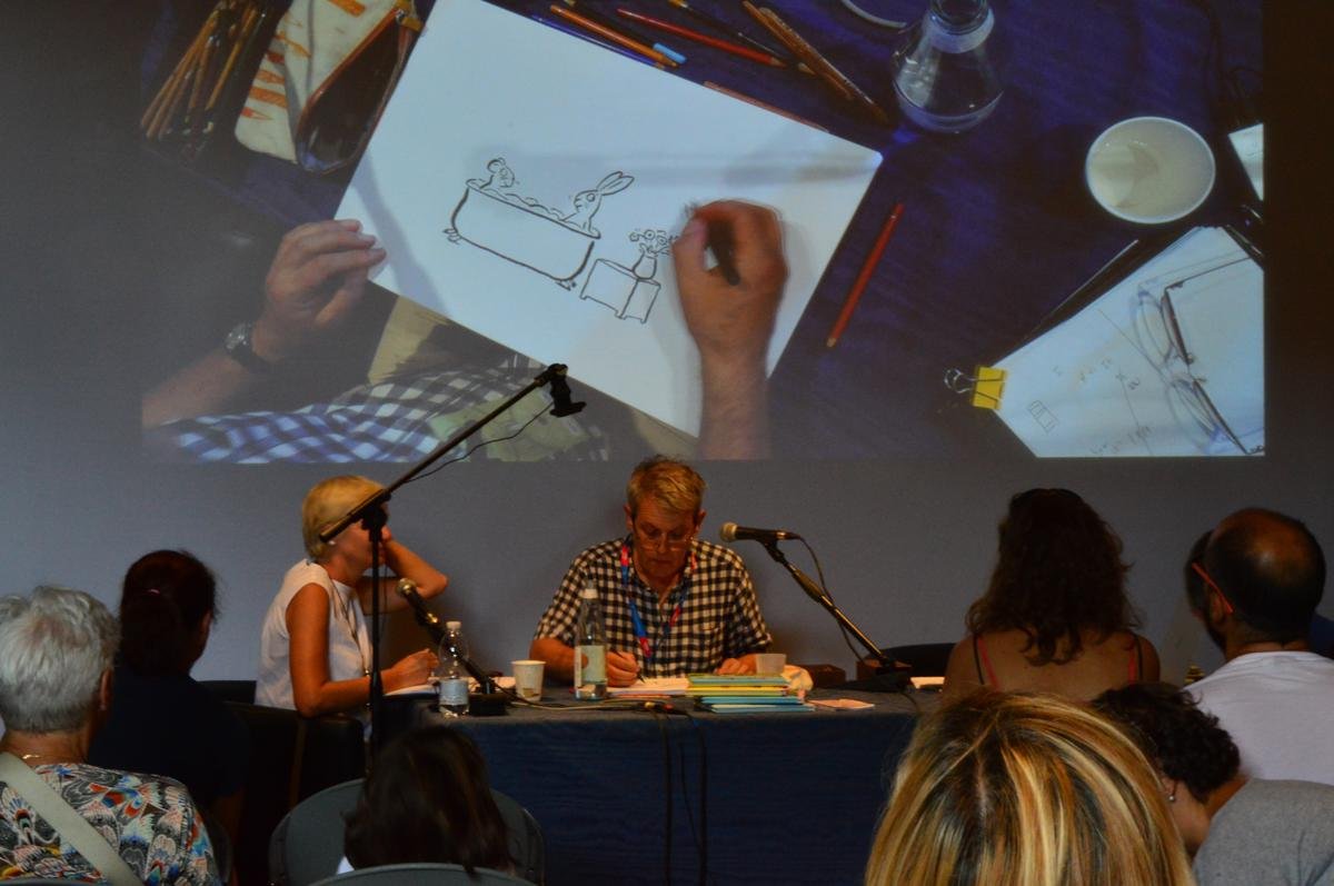 Axel ha presentato ai piccoli spettatori i suoi personaggi prima disegnando e poi sfogliando alcuni libri, mentre Vera li animava con grande emotività.